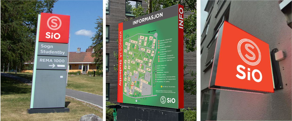På uthengskilt og pyloner i forbindelse med studentbyer/hus skal man benytte hvit SiO-logo på SiO-rød bakgrunn. På oversiktskart bruker man egnet flate.